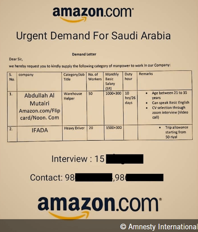 Gli uomini intervistati hanno lavorato nei magazzini Amazon di Riyadh tra il 2021 e il 2023, ed erano assunti da due contractor che fornivano personale: Abdullah Fahad Al-Mutairi Support Services Co. (Al-Mutairi), or Basmah Al-Musanada Co. for Technical Support Services (Basmah).
