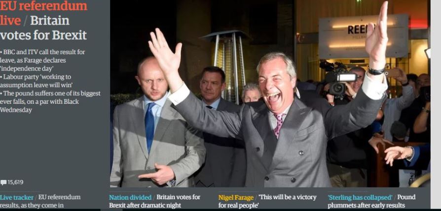 “Sarà Brexit. Mentre si contano gli ultimi voti, il risultato vede il Leave raccogliere il 51,8% dei consensi, mentre il Remain si ferma al 48,2%. Il paese si è spaccato ma la maggioranza ha deciso, puntando sull’uscita di Londra dall’Unione Europea. La sterlina crolla su se stessa. Il Regno Unito, guidato da un leader che prima ha voluto il referendum e poi lo ha perso, si ritrova praticamente privo di un governo. Se, anzi quando, David Cameron lascerà il passo, sarà molto probabilmente Boris Johnson a succedergli.