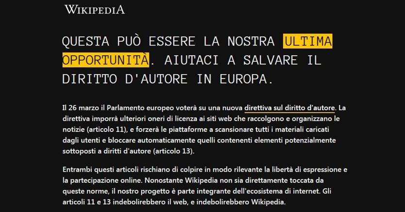 La direttiva sul diritto d’autore su cui oggi vota il Parlamento Europeo è stata osteggiata dalle principali piattaforme che ospitano contenuti (da Google a Facebook ). Persino Wikipedia ha deciso di “chiudere” per un giorno nel nostro paese dopo aver calato il sipario in Germania, Repubblica Ceca, Slovacchia e Danimarca.
